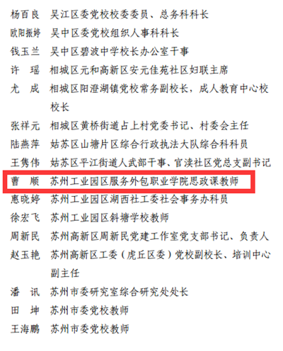 近期,苏州市委宣传部下发了《关于公布苏州市首批新时代基层理论宣讲名师培育对象名单的通知》,我校思政课教师曹顺成功入选,成为苏州市首批新时代基层理论宣讲名师培育对象。