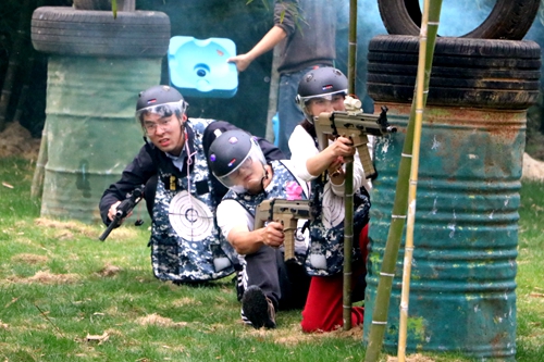 “真人CS”竞技赛共分为两支队伍体验丛林战、基地站、斩首行动等项目,分头作战、两面夹击、迂回包抄……不同的作战技术、充沛的体力、不懈的坚持,在竞技活动中体现的淋漓尽致。