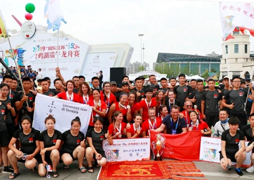上午9时,比赛准时开始,我校龙舟队员们与其他15支大龙舟队一起同场竞技。伴随着看台上大批外包学子的呐喊,我校龙舟队员整齐划一地下腰、伸臂、奋力划水,伴随着震耳欲聋的口号声和铿锵有力的击鼓声,加速向终点前进,经过预赛和决赛的激烈角逐,我校男子龙舟队和威尼斯大学联队共同站在了领奖台上,威尼斯大学联队还获得了组委会颁发的“国际合作奖”。