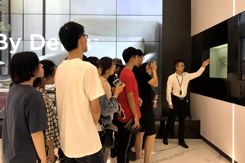 我校师生参观了DELOS智能家居展厅及在软硬装材料设计中心。DELOS智能家居展厅约有500多平米,几乎涵盖了所有家居环境的效果呈现,展厅内体现了智能科技与人体工程学完美结合,无障碍设施设计体贴入微,参观过程中公司员工给同学们讲解了每个空间选用的装修材料及选用原因和利弊。软硬装材料设计中心里讲解人员对各类装修材料进行了分门别类的介绍,包含基础材料、地面材料、透光材料和装饰面等,同学们在展厅中通过触摸、敲击,体验着各种材料带给人的感受,认真记笔记,拍照记录不同材质。