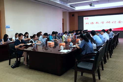 为进一步提高我校双语教学水平, 6月13日下午在我校在言子楼B416会议室召开了双语教学研讨会,学校党委书记、校长严世清,督导教师徐青根教授及全体外语教师参加了此次会议,会议由教学服务中心主任杜梓平主持。