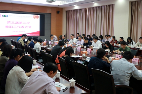 预备会议阶段审议通过了《第三届第三次教代会议程及工作安排》。在正式会议上,事业发展中心主任严仲兴详细解读了提交本次教代会审议的一系列制度性文件,并对前期征集的代表反馈意见进行了解释说明,学校工会对《工会经费使用管理办法》修订的背景进行了介绍,随后代表们采用举手表决形式逐一审议通过了《薪酬管理制度》(2018年审议稿)、《绩效考核方案》(2018年审议稿)、《关于教职工进修培训、学历或职称晋升后的相关管理规定》(2018年审议稿)和《工会经费使用管理办法》(2018年修订版)等制度性文件。
