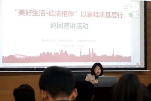 11月22日下午,由苏州市法宣办、苏州市司法局、共青团苏州市委员会共同举办的“美好生活·德法相伴”以案释法基层行巡回宣讲活动在我校槎轩楼104举行,我校近200名学生干部参加了活动。