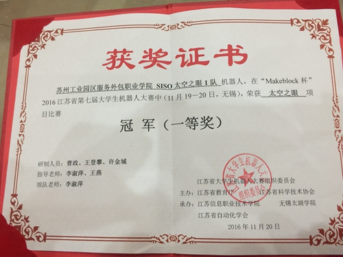 11月19-20日,由江苏省教育厅、江苏省科学技术协会联合主办的“Makeblock杯”江苏省第七届大学生机器人大赛在江苏信息职业技术学院举行,我校纳米科技学院共组织了4支代表队参加此次比赛,其中SISO太空之眼1队、2队荣获“太空之眼”项目比赛的冠、亚军。