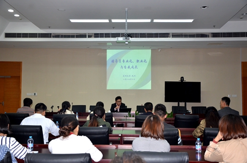 10月26日下午,学生发展中心邀请到苏州大学沙钢钢铁学院学工办主任孔川博士在言子楼413会议室为我校全体辅导员开展了题为《辅导员专业化、职业化与自我成长》的培训讲座。学校副校长章亦华、学生发展中心全体工作人员、各二级学院党总支书记及辅导员参加讲座。