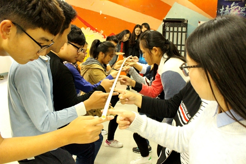 活动伊始,会长尹帅首先为大家阐释了“心理素质拓展活动的内容和意义”,明确了本次活动目的:团结一致,携手共进。活动以心理运动会的形式展开。活动从“珠行万里”开始,“不倒森林”、“齐眉棍”等活动依次登场。活动场面热闹非凡。锻炼团队协作能力的“心有千千结”活动使同学们产生了浓厚的兴趣,全场气氛达到了高潮,通过所有成员共同合作,将交错的“手链”成功解开,最后形成一个大圆圈。心理中心老师也来到场地上,为同学们呐喊加油,比赛场上一片欢声笑语。